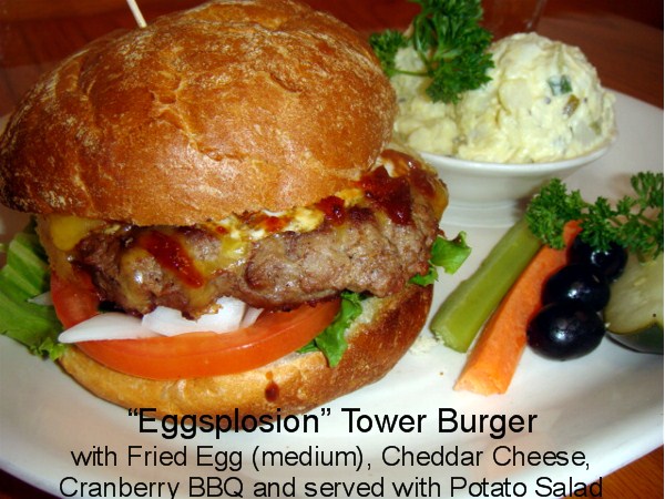 EggsPlosion Tower BurgerExplosion Of Angus Burger, Medium Egg, Cheddar Cheese And Cranberry Bbq Sauce Topping Our Tasty And