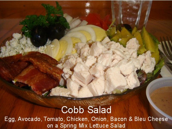 Cobb SaladOn A Bed Of Spring Mix Salad... Egg, Avocado, Tomato, Chicken, Onion, Bacon, Bleu Cheese. Your Choice Of