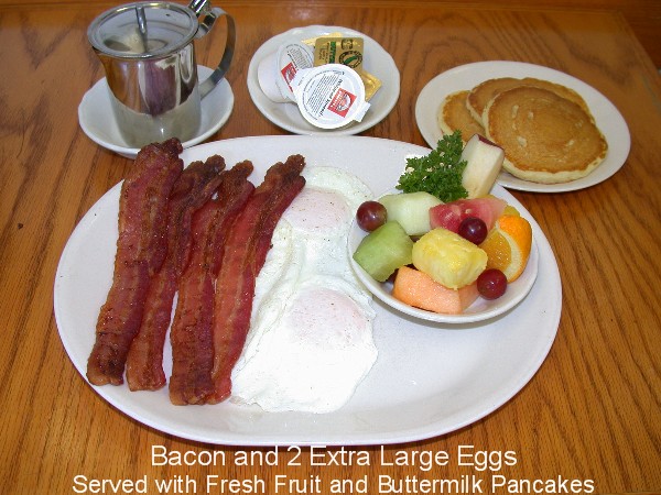 4 Strips Of Lean Bacon And 2 Extra Large Eggs Served With 3 Dollar Pancakes And Fresh Fruit 8.95 |