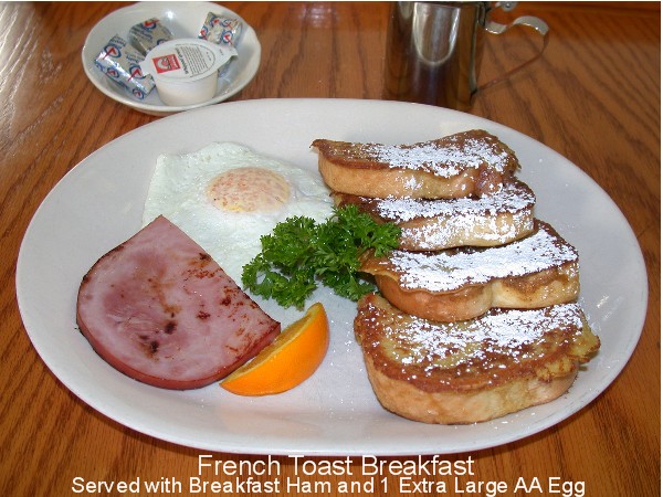 Four Half Slices Of French Toast Served With 1/2 Order Of Meat And One Extra Large Egg 6.55 |