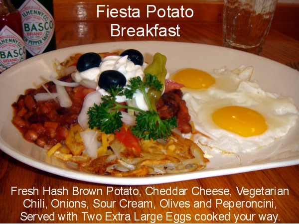 Hash Brown Potatoes Topped With Cheddar Cheese, Chili Tomatoes, Onions, Sour Cream, Olives And Peperoncini. Served With 2 Eggs 6.95 |