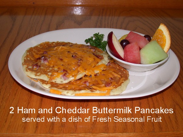 Two Buttermilk Pancakes Baked With Diced Ham And Cheddar Cheese. Served With Fresh Fruit. 6.95 |