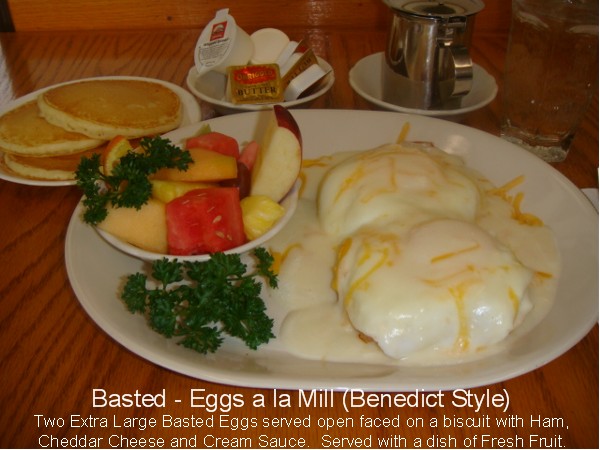 Open Faced Biscuit Topped Wiih 2 Basted Eggs, Thin Ham, Cheddar Cheese And Cream Sauce. Served With Fruit And Pancakes 7.95 |