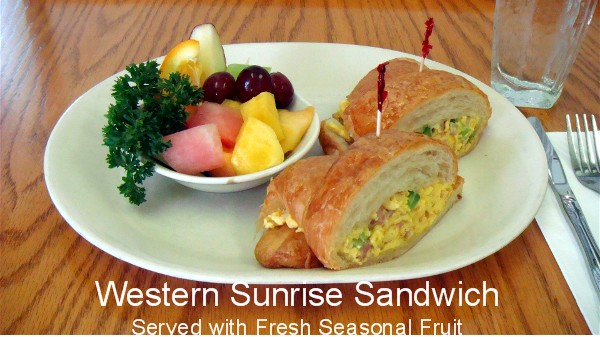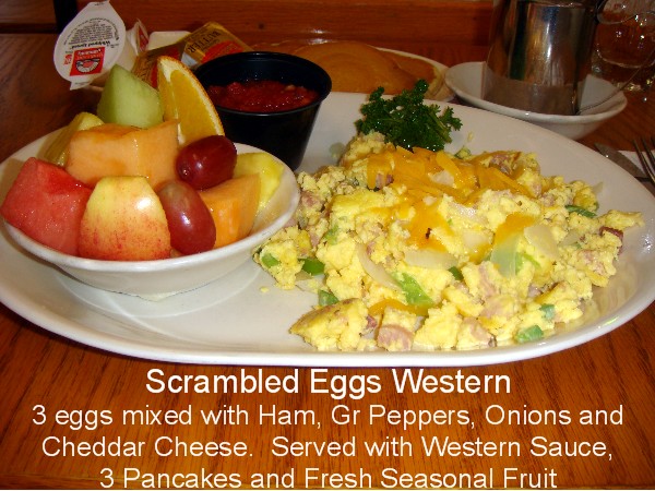A Great Blend Of Cheddar Cheese, Green Pepper, Diced Ham, And Onion; Served With Western Sauce, 3 Dollar Pancakes And Fresh Fruit. 7.25 |