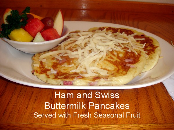 Two Large Buttermilk Pancakes Filled With Chopped Ham And Cheddar Cheese. Served With Fresh Fruit. 6.50 |