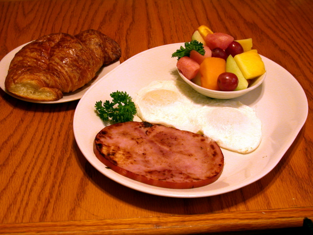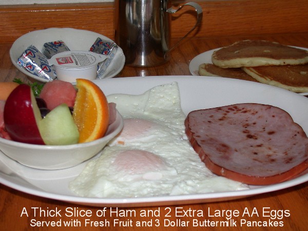 A Thick Slab Of Ham And Two Extra Large Fresh Eggs. Served With 3 Dollar Buttermilk Pancakes And Fresh Fruit. 7.25 |