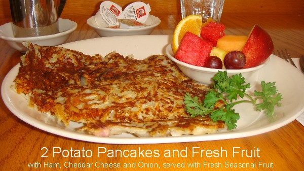 Two Potato Pancakes, A Mixture Of Potato, Ham, Cheddar And Onion. Served With A Dish Of Fresh Fruit 7.75 |