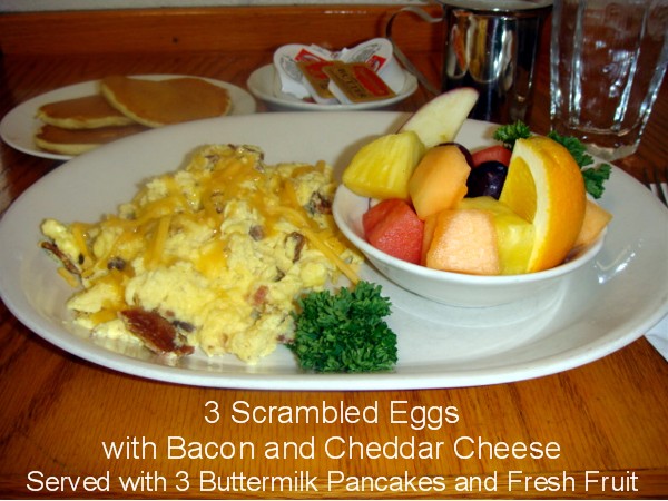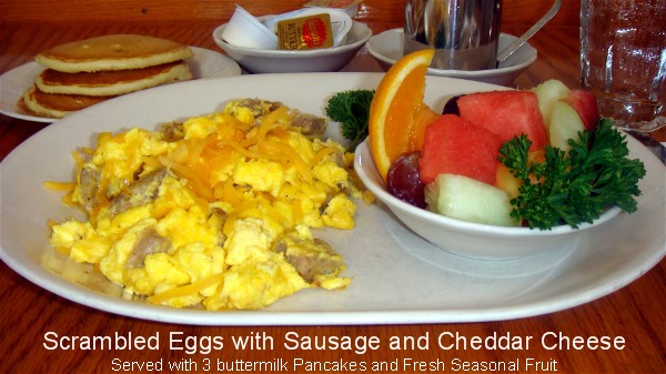 Three Scrambled Eggs With Breakfast Sausage Pieces And Cheddar Cheese. Served With Fresh Fruit And 3 $ Buttermilk Pancakes. 7.25 |