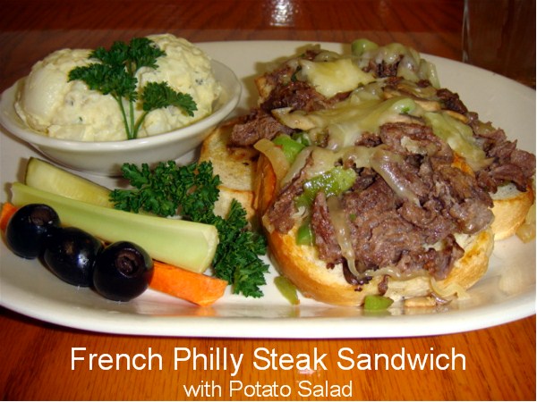 Thinly Sliced Beef Topped With Onions, Peppers, Mushrooms And Swiss. Served Open Faced On French Bread With Potato Salad 9.25 |