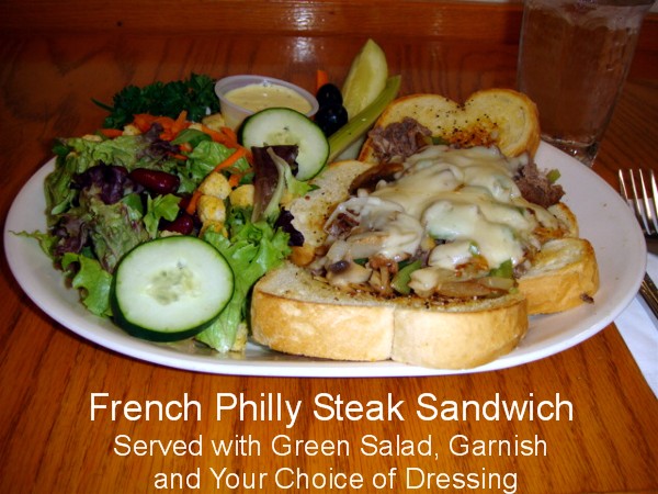 A Seasoned Country Fried Steak Sandwich Served Open On Grilled French Bread. Served With Garden Green Salad. 7.95 |