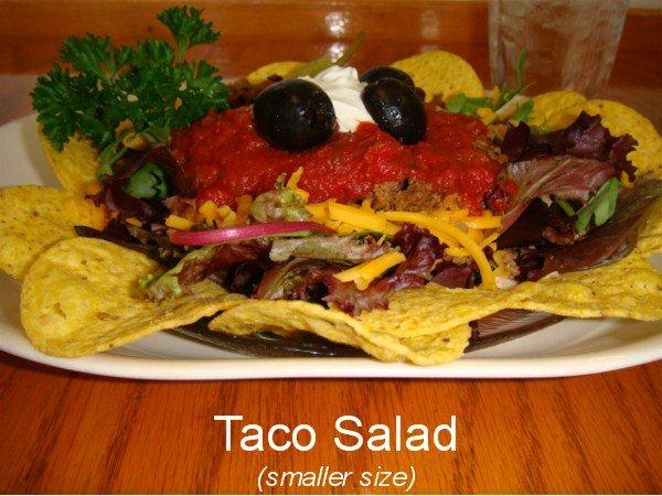 A Vegetarian Chili Nacho With Chips, Cheese, Onion, Sour Cream And Olives. Served With A Green Salad. 7.95 |